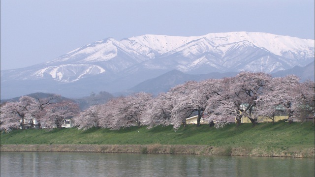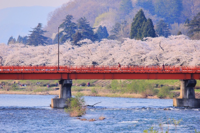 さくら名所100選に数えられる千本桜です。白石川の澄んだ青色と蔵王連峰の残雪、千本桜の桜色のコントラストが楽しめます。