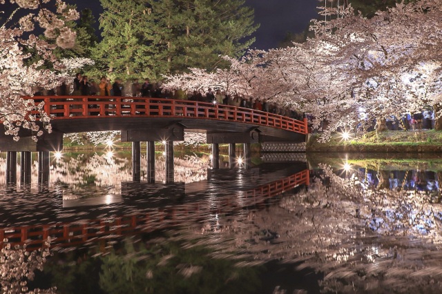 日本屈指の桜の名所としても知られており、城門や天守閣と公園内の花々が美しい観光スポットとなっています。例年、4月下旬~5月上旬の開花時期に開催される「弘前さくらまつり」には国内外から約200万人が訪れます。「桜のトンネル」、「桜のハート」、「花筏(はないかだ)」は必見です。