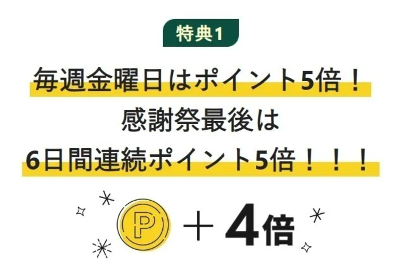特典① 毎週金曜日はポイント5倍!最後は6日間連続ポイント5倍!!!